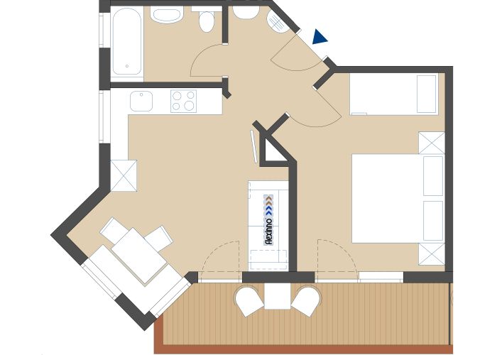 - Vorraum, Bad mit Badewanne und WC (Fön vorhanden), Schlafzimmer mit Stockbett, Wohnküche mit Flexino-Bett/Couch-System (Infolink Flexino s. Startseite)