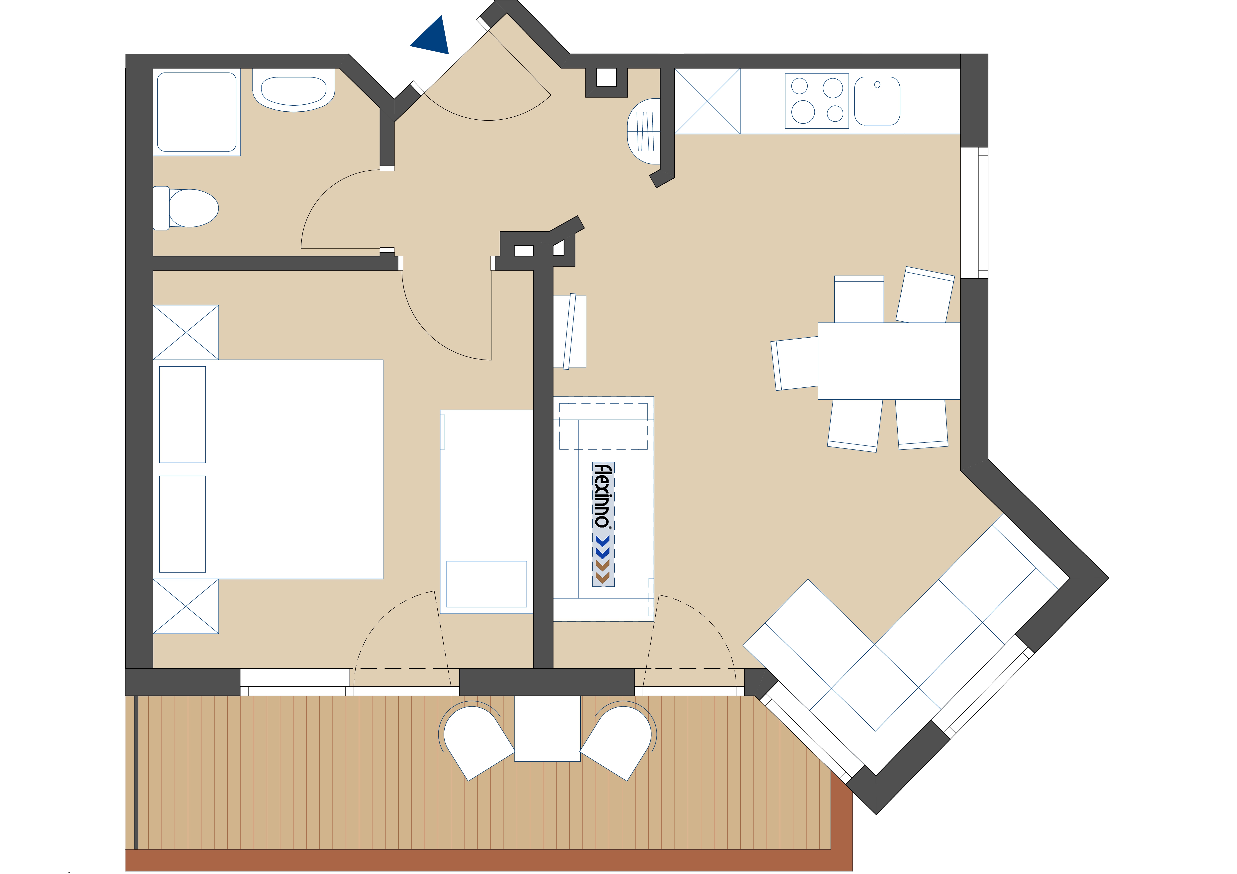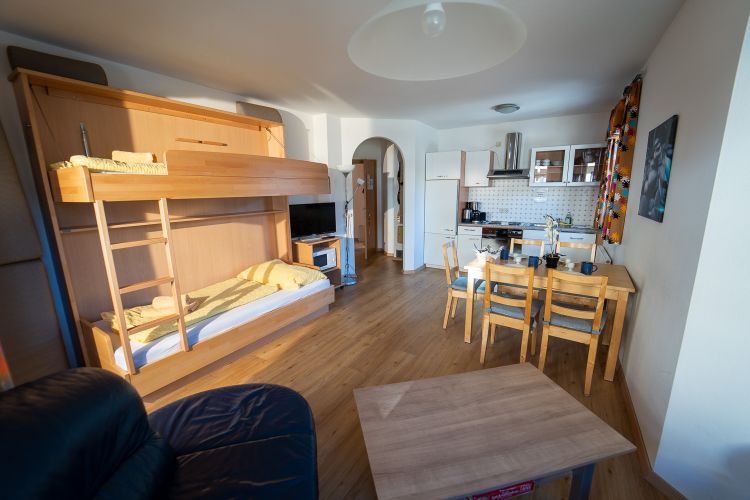 - Vorraum, Bad mit WC (Fön vorhanden), Schlafzimmer mit Stockbett, Wohnküche mit Flexino-Bett/Couch-System (Infolink Flexino s. Startseite)