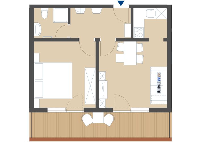 - Vorraum, Bad mit WC (Fön vorhanden), Schlafzimmer, Wohnküche mit Flexino-Bett/Couch-System (Infolink Flexino s. Startseite)